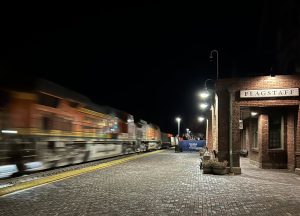 Here in Flagstaff, trains rumble through town all day, every day–mile-long freighters on the BNSF line, the east- and westbound Southwest Chief. Their chrome engines gleam in the Arizona sunshine. The blare of the whistle sings all night.